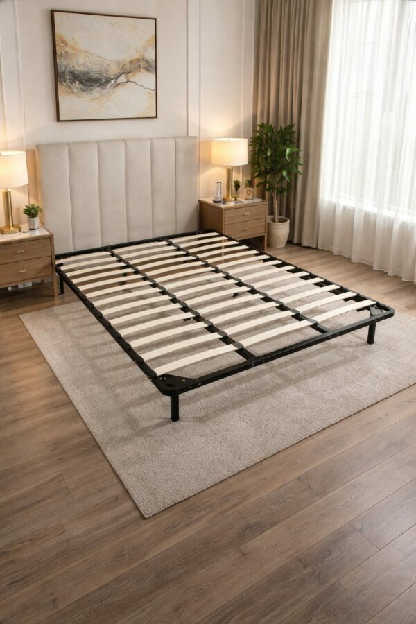 Le sommier à lattes est la base de lit la plus répandue, offrant un soutien ferme à souple, une excellente ventilation du matelas et une bonne absorption des mouvements pour un meilleur confort. Il est idéal pour la plupart des matelas (mousse, latex, ressorts) et prolonge leur